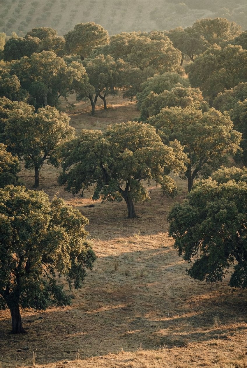 Six to eight units set within the dehesa — ancient cork oak and holm oak across pale earth, one of the most biodiverse landscapes in Europe. Rammed earth and local stone construction. Ibérico pork from the surrounding farms, wild herbs, and the local wine tradition. A seasonal chef rotates every three months.